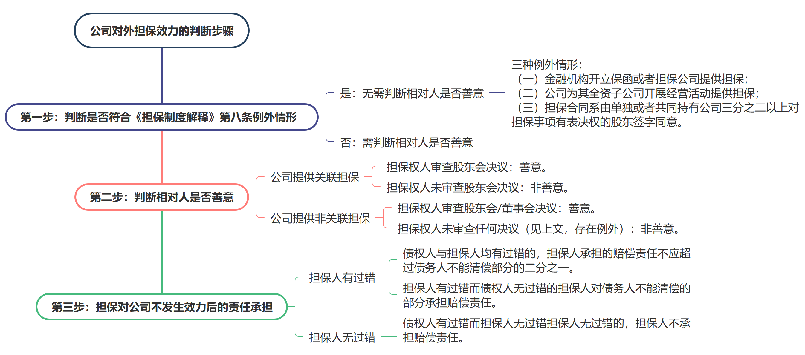 第一步:判断是否属于《担保制度解释》第八条规定的三种例外情形。是则无需公司决议,否则需判断相对人是否善意。
