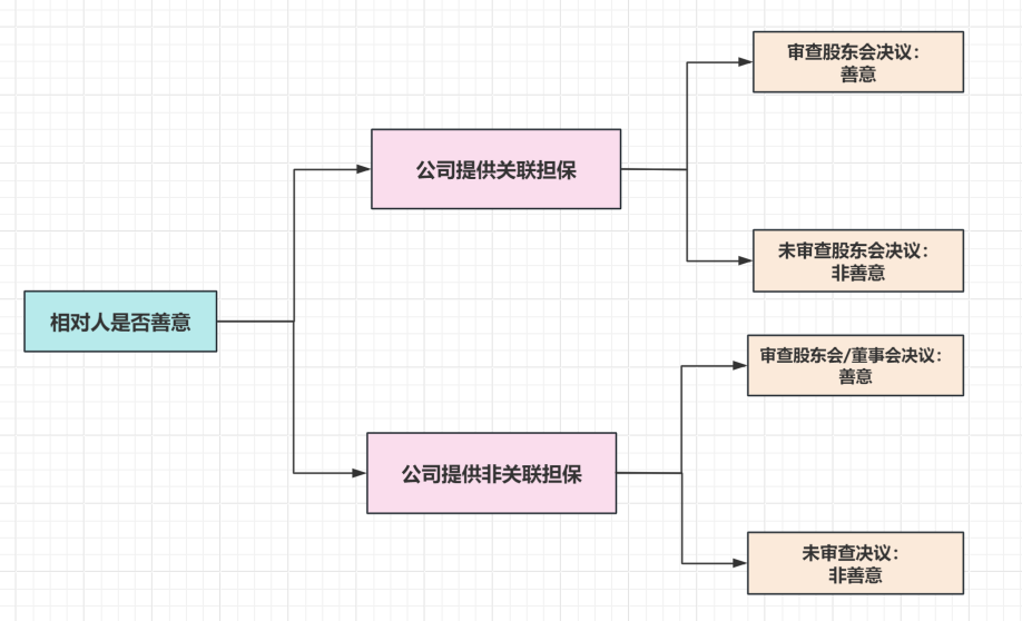 第二步,判断相对人是否善意。若公司提供关联担保,则相对人审查股东会决议为善意;如果提供非关联担保,则相对人审查股东会或董事会决议为善意,未审查为非善意。相对人善意,则担保有效,相对人非善意则担保合同不对公司发生效力,参照适用担保无效的规定处理。
